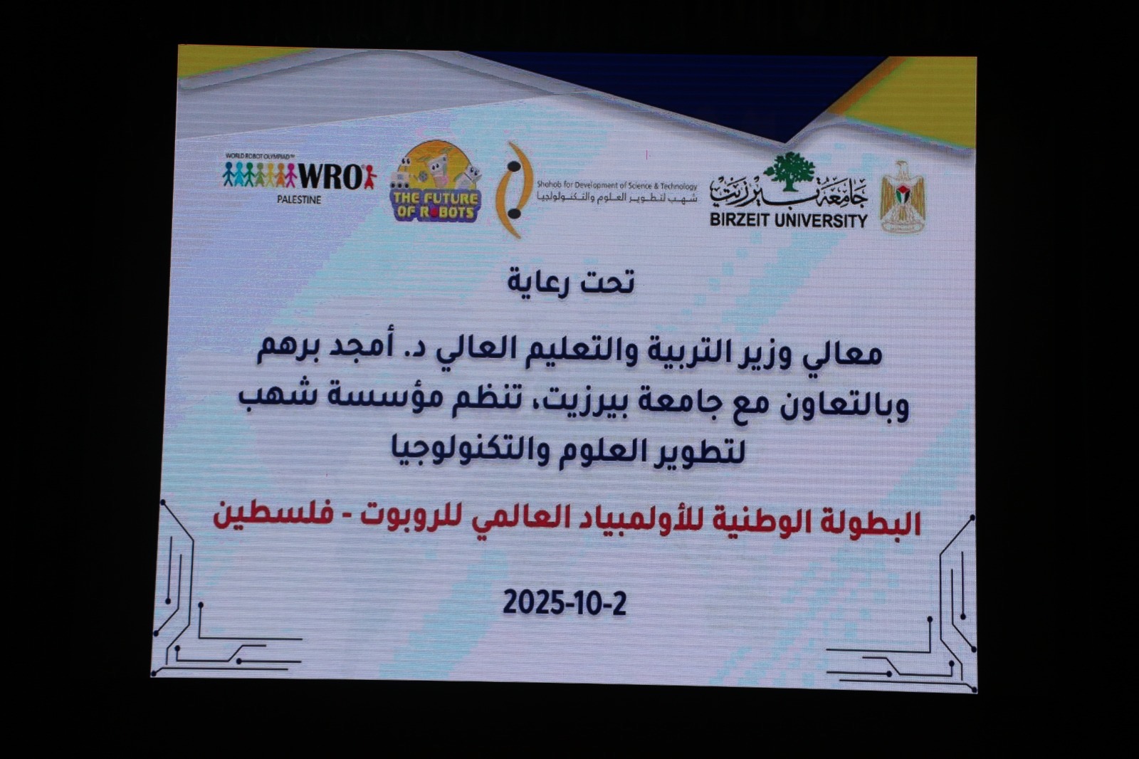 شاركت وزارة التربية والتعليم العالي، عبر الإدارة العامة للمصادر والتقنيات التربوية، بدعم من الوكالة البلجيكية للتعاون الدولي (Enabel) وبالتعاون مع مؤسسة شُهب لتطوير التعليم والتكنولوجيا، المُنظم الوطني للأولمبياد العالمي للروبوت، في فعاليات البطولة الوطنية للروبوت، والتي عُقدت اليوم الخميس في جامعة بيرزيت.