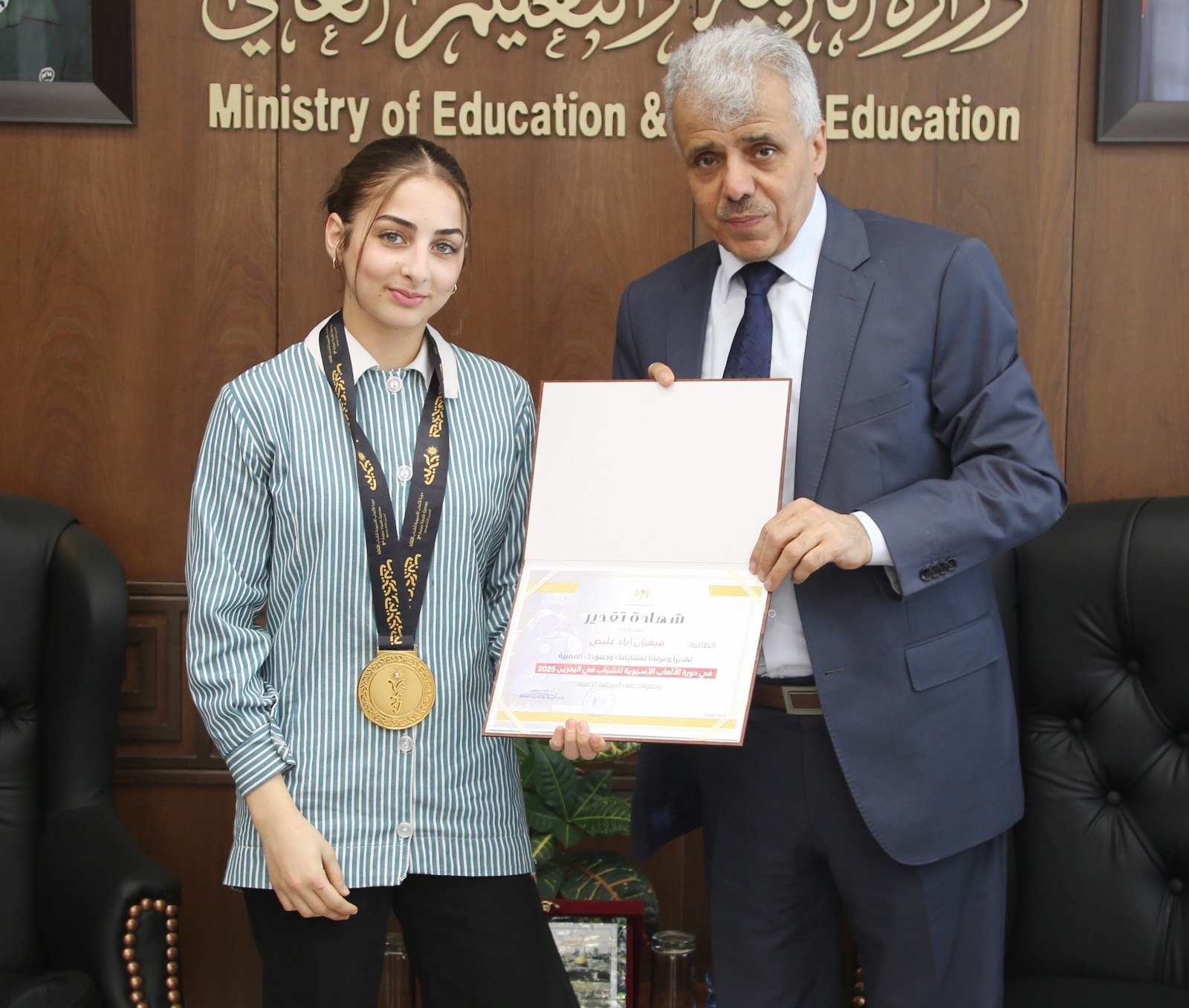 كرم وزير التربية والتعليم العالي أ.د. أمجد برهم، اليوم الثلاثاء، بطلة آسيا في المواي تاي الطالبة في مدرسة بنات البيرة الثانوية البطلة فيفيان عليص؛ لحصولها على أول ميدالية ذهبية لفلسطين في دورة الألعاب الآسيوية للناشئين (المواي تاي)، وذلك في البطولة التي أقيمت مؤخرا في العاصمة البحرينية المنامة.