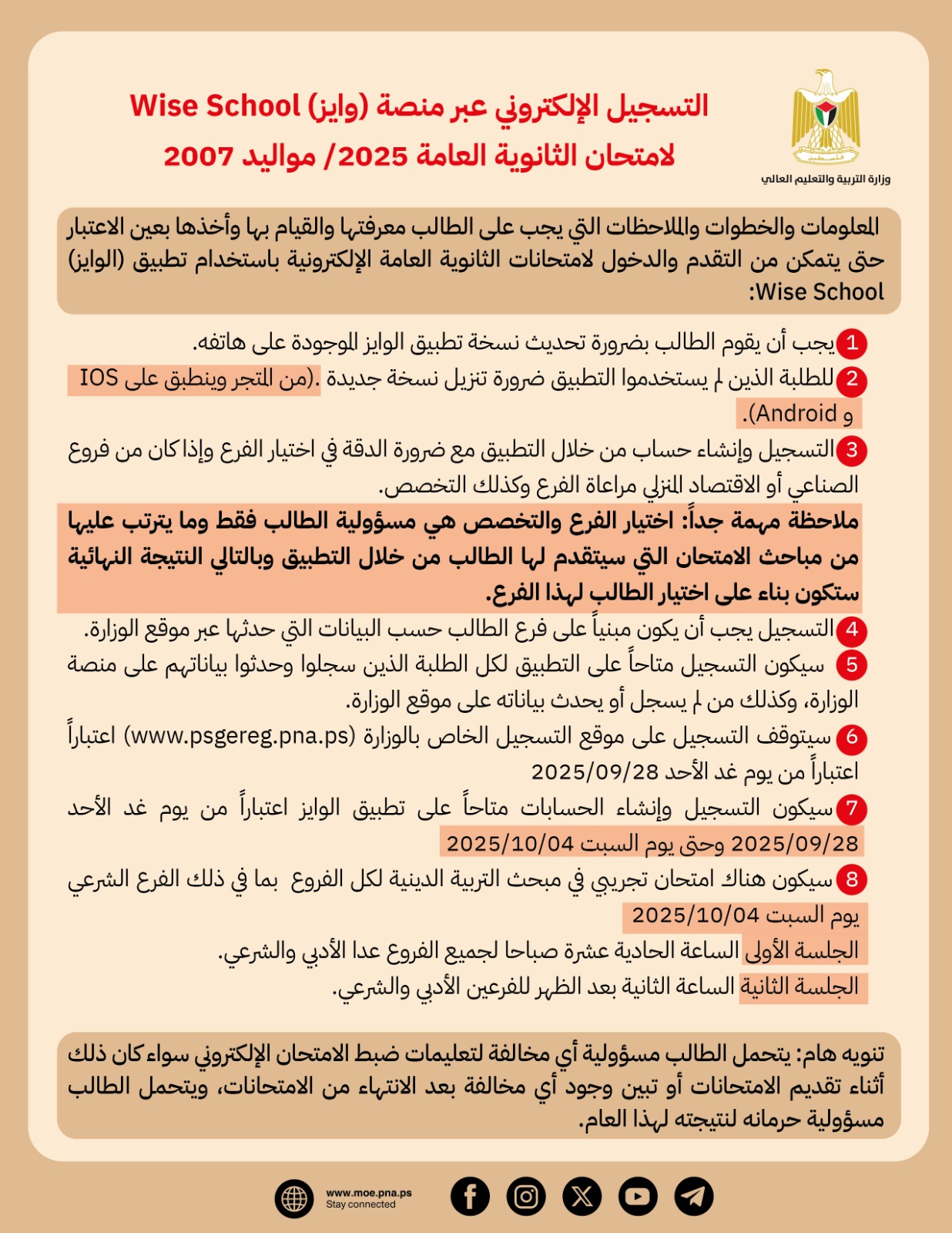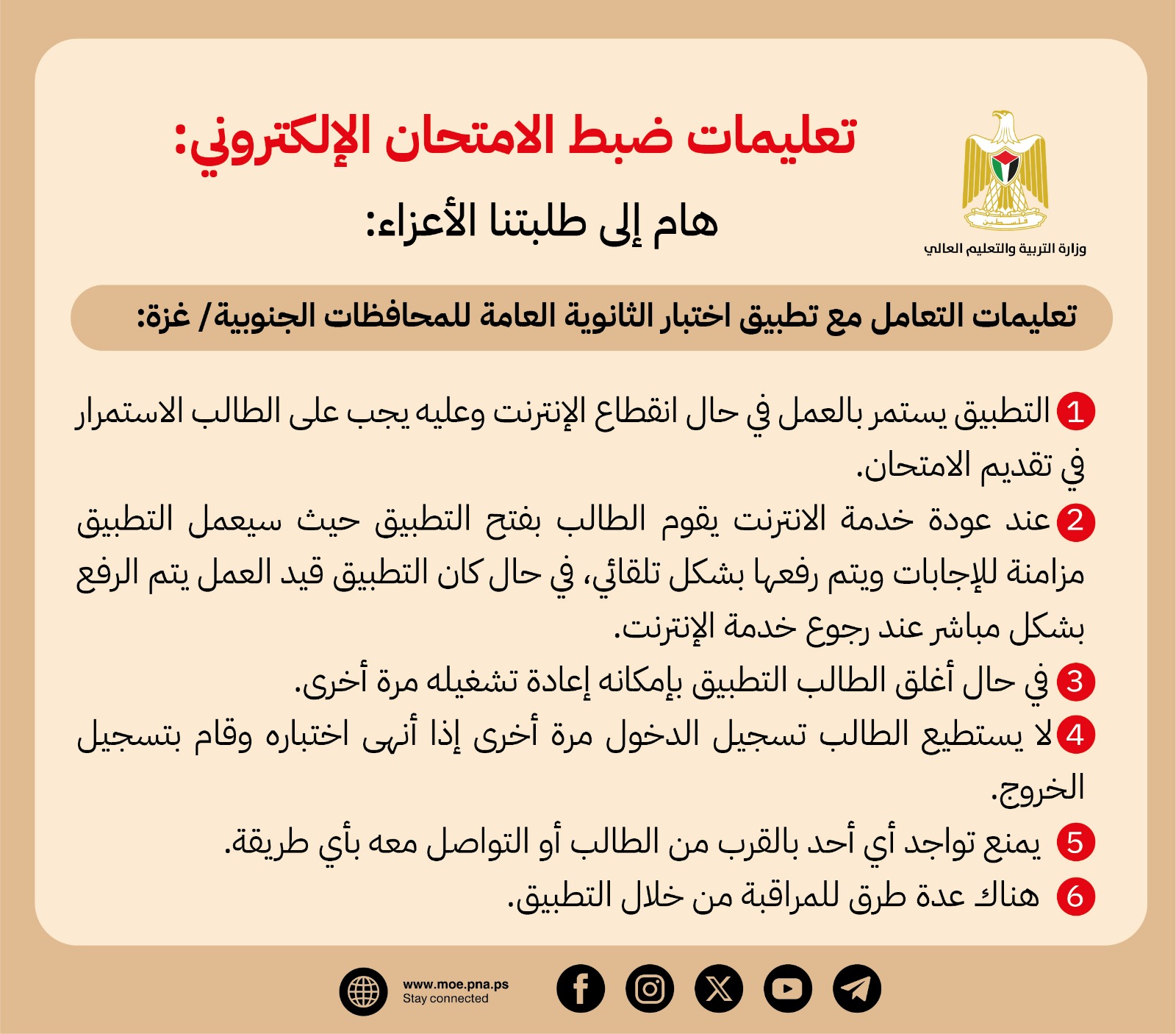 إرشادات التقدم للامتحان الإلكتروني للصف الحادي عشر لطلبة المحافظات الجنوبية (#غزة)