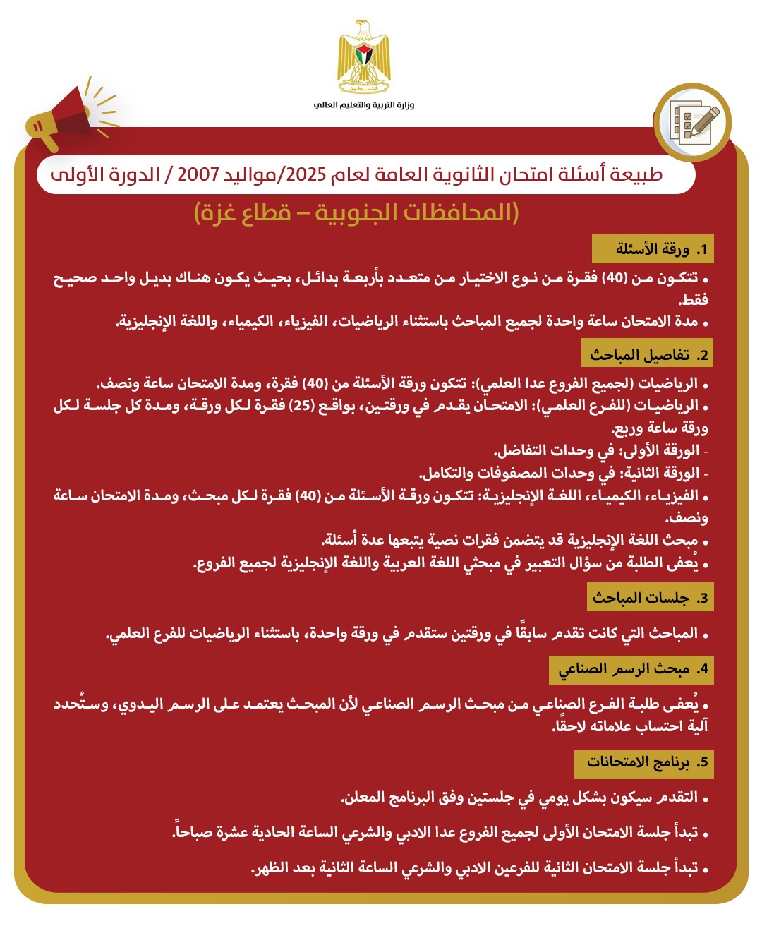 طبيعة أسئلة امتحان الثانوية العامة لعام 2025/مواليد 2007/ الدورة الأولى
