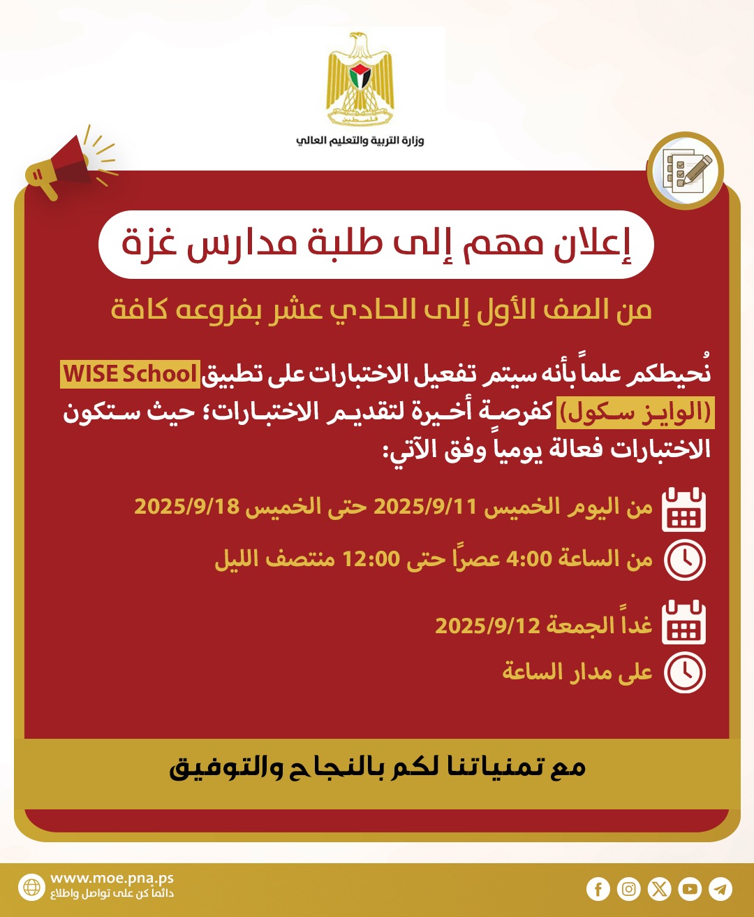 إعلان مهم إلى طلبة مدارس غزة- من الصف الأول إلى الحادي عشر بكافة فروعه