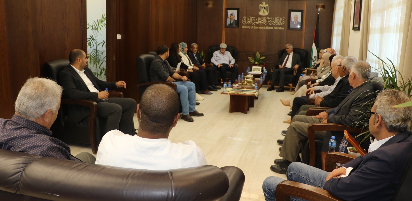 استقبل وزير التربية والتعليم العالي أ.د. أمجد برهم، في مكتبه، وفداً برئاسة د. غسان عبد الله يُمثل اللجنة الوطنية التحضيرية لمؤتمر "أي تربية وتعليم نريد للقدس، وفي القدس، وعن القدس"؛ الذي عقده، مؤخراً، مركز الدراسات والتطبيقات التربوية تحت رعاية السيد الرئيس محمود عباس؛بمشاركة واسعة من أكاديميين وباحثين وخبراء تربويين وفنانين ومؤسسات مجتمع مدني.